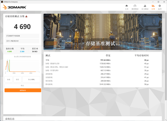 在Intel平台上,3Dmark存储基准测试得分为4690,远超平均成绩,平均带宽为797.44MB/s,移动游戏速度高达5141.52MB/s。