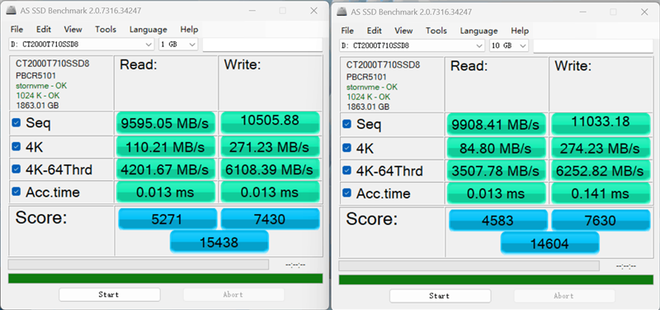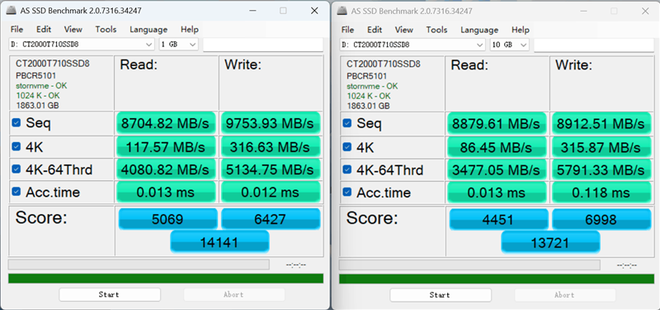 英睿达T710比较特别的是1TB版本拥有最强的14900MB/s的顺序读取速度,但我们这次收到的是2TB的版本,没有机会见到这个几乎"圆满"的速度了,略有遗憾。