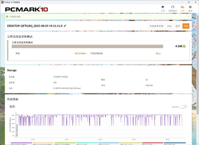 在AMD平台下,PCMark10完整系统盘基准测试成绩为4240,平均带宽为651.63MB/s,平均存储时间为38μs。