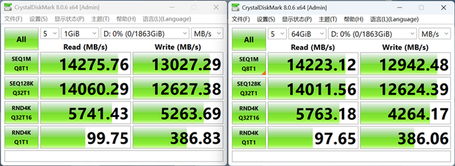在CrystalDiskMark测试中,Intel测试平台的1GB测试数据下,顺序读写速度分别14275MB/s和13027MB/s,4K随机读写读写速度为99.75MB/s和386.83MB/s,64GB测试数据的结果相差不大。