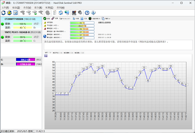 配合简单的主板自带的被动散热片,英睿达T710 SSD在连续工作时的温度只有57度,不用担心机箱内热量堆积,运行更加稳定。