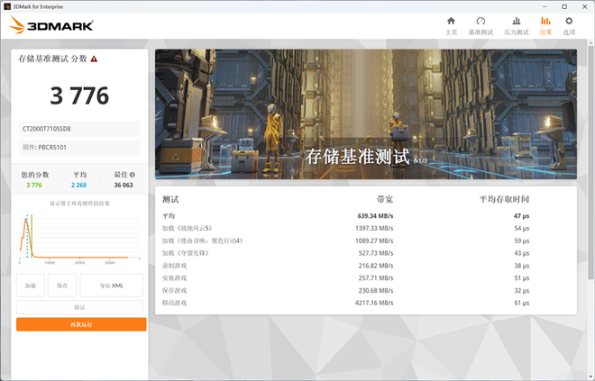 在AMD平台下,3Dmark存储基准测试成绩略低,为3776,但依然大幅超过平均成绩,平均带宽为639.34MB/s移动游戏速度可达到4217.16MB/s。