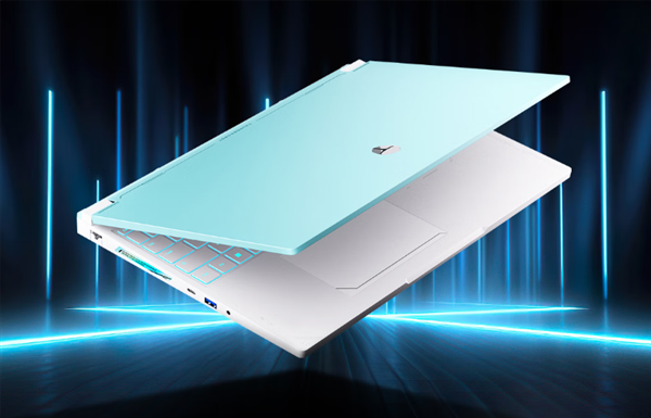 机身整体采用天青配色,屏幕支持180° 开合,配备RGB背光键盘。厚度约23mm,质量约2.5kg,颜值党必备。