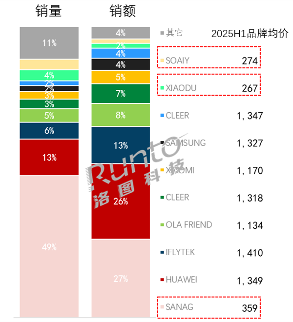 IFLYTEK(科大讯飞)、OLA FRIEND(字节跳动旗下)、CLEER等品牌紧随其后,分别以13%、8%、7%的销额占比进入前五。