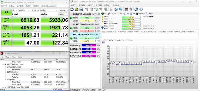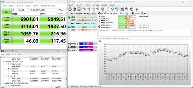 同时我们很惊讶的看到,PC450在裸条状态下进行CrystalDiskMark测试时,硬盘的读写性能几乎没有降低。顺序读取6900MB/s,顺序写入5949MB/s。