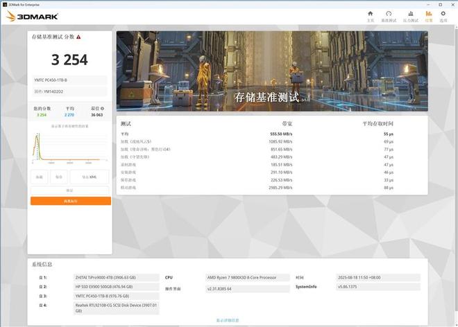 PC450 1TB的表现和PCIe 5.0 SSD非常接近,总分3254, 延迟仅有55微秒,高于绝大多数消费级PCIe 4.0 SSD。