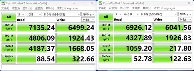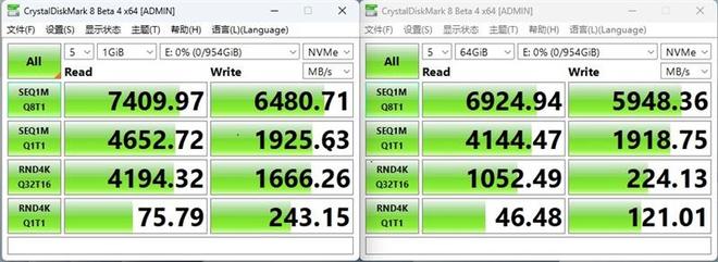 右边是64GB的测试,顺序读取速度6924MB/s、写入5948MB/s,4K随机读取46MB/s、写入121MB/s。