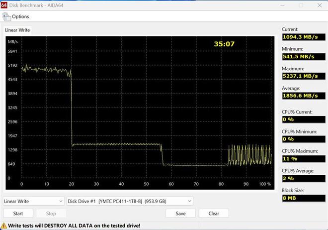 这是PC411 1TB的测试成绩,整个测试耗时35分钟,平均写入速度1856MB/s、最高为5237MB/s。