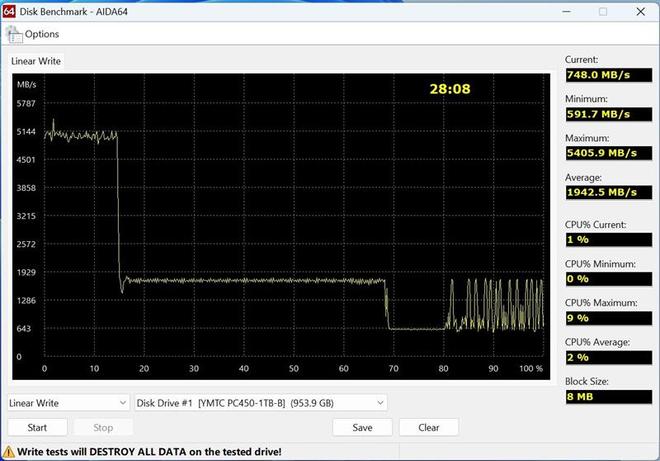这是PC450 1TB的测试成绩,整个测试耗时28分钟,平均写入速度1942MB/s、最高为5405MB/s。