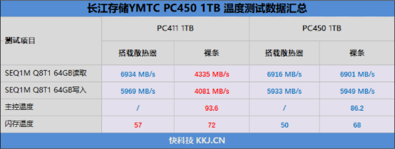 而在没有散热片也就是裸条状态下,X4-9070闪存才得以发挥出真正的实力。在长时间高负载读写状态下,PC450 1TB的主控温度比PC411 1TB低了7度。