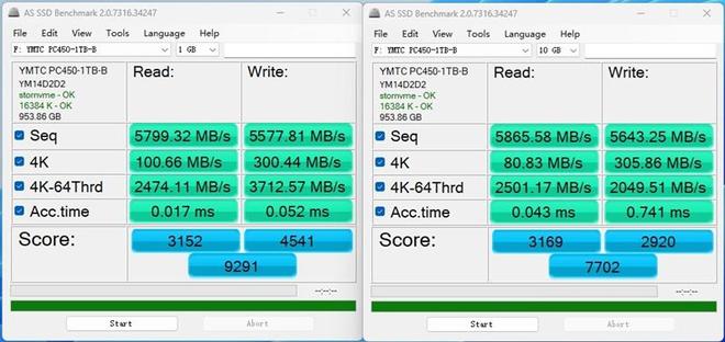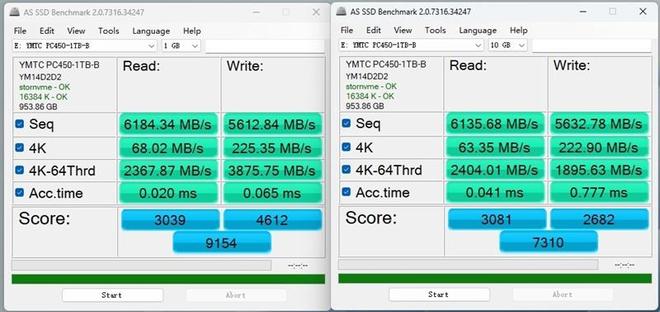 左边是1GB容量的测试。在AS SSD Benchmark的测试中,PC450 1TB得分为9154分。顺序读写速度分别为6184MB/s、5612MB/s,4K读写速度则是68MB/s、225MB/s。