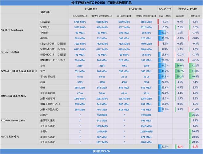 在Intel平台上,PC450 1TB SSD相比上代PC411 1TB有12%的性能提升,而在AMD平台上,提升幅度依然有11%。
