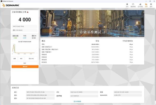 3DMark的跑分来到了4000,比AMD平台高了800分。平均带宽686MB/s,在移动游戏时,带宽能达到3387MB/s,平均存取时间45微秒。
