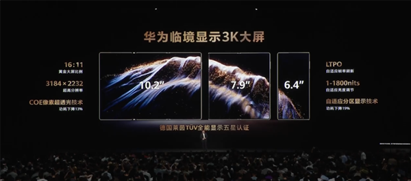 搭载一块10.2英寸的华为临境显示3K大屏,分辨率达到3184*2232,屏幕比例是16:11,支持LTPO智适应刷新率,亮度高达1800nits,同时还支持自适应分区显示技术,功耗下降19%。