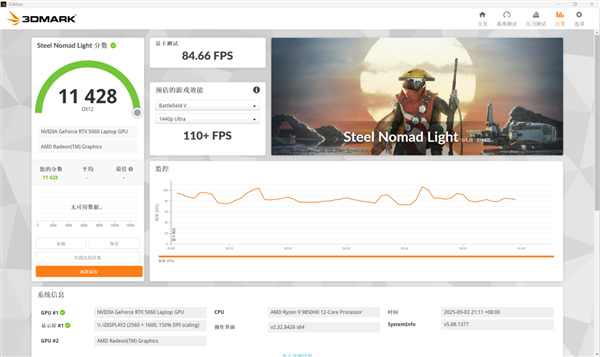 SNL测试,总分数为11428分,运行时平均帧数为84.66fps。