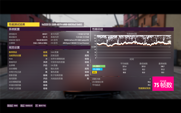 2K分辨率,开启极端画质,2XMSAA,可以跑到平均75帧。