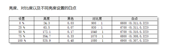 对比度,最高亮度为520nits,平均对比度为1000:1。