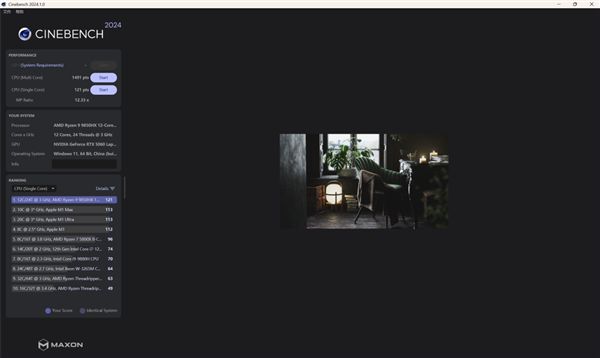 在cinebench24中,CPU单核心得分121pts,多核心获得1491pts。