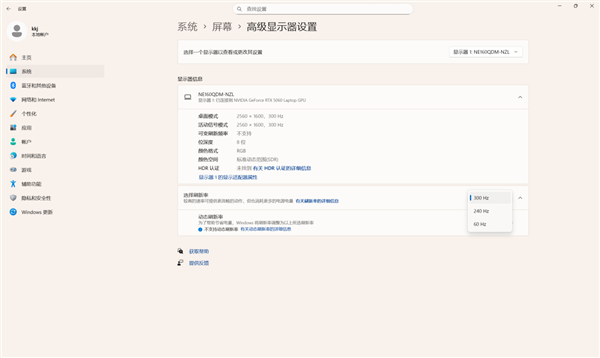 七彩虹橘宝R16 Ultra拥有一块16英寸,最高300Hz的屏幕,一共有300,240,60Hz三个挡位可选,默认是8bit色深。
