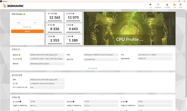 3Dmark的CPU测试,最大线程分数为12365,单线程分数为1180.