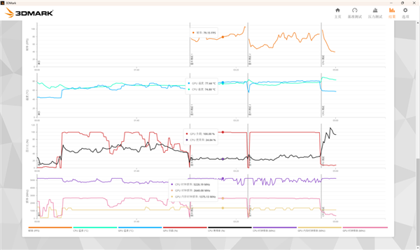 在静音游戏挡位,单烤CPU能运行在70W。双烤状态下,在开始烤机后的几秒,CPU功耗能跑到60W,之后稳定在40W,总性能分配为40W+90W。双烤10分钟后,CPU温度稳定在78度。GPU温度为75度。