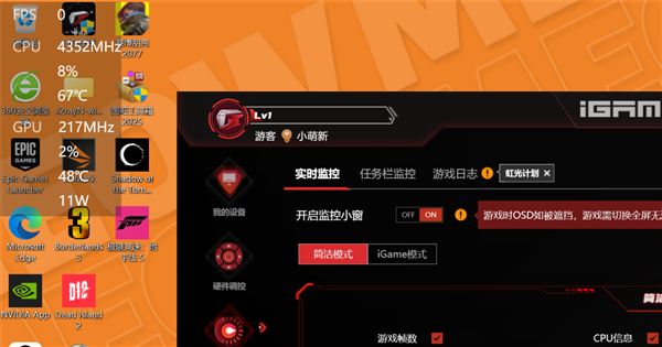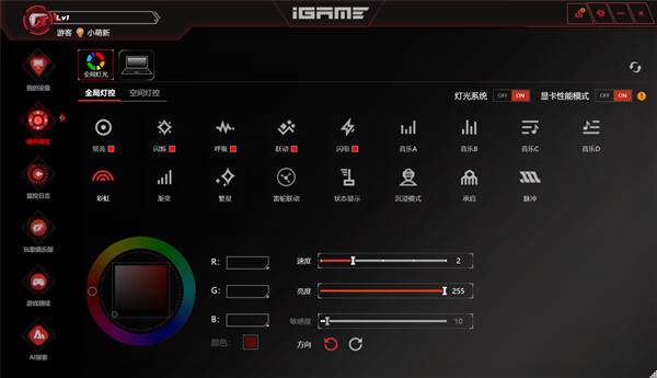 在硬件调控界面,可以控制全局的灯光表现效果。