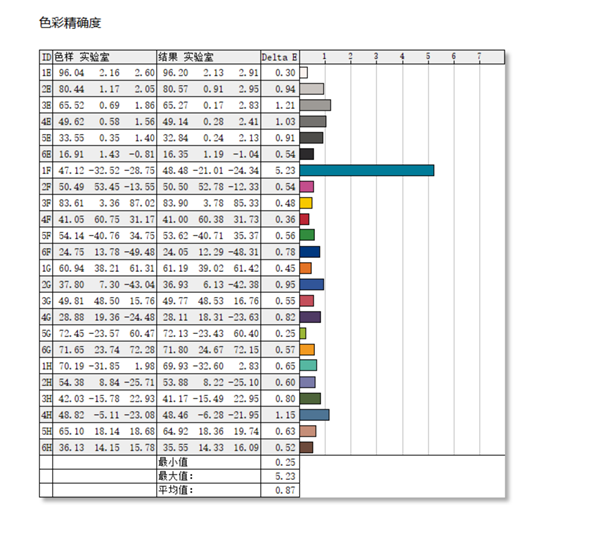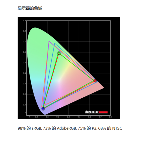 色域检测中,可以看到屏幕色域为98%的sRGB, 73%的AdobeRGB, 75%的P3, 68%的NTSC。
