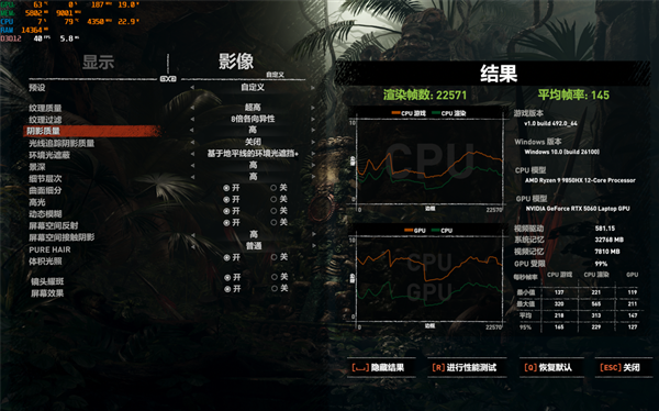 在《古墓丽影:暗影》中,开启2k DLSS平衡档,手动开启最高画质,关闭光追,平均游戏帧数可达145帧。