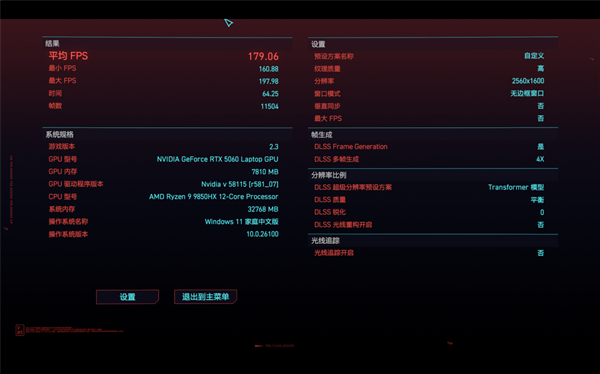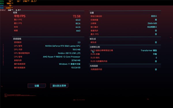 游戏表现中,在2.5K高分辨率的屏幕下,无论是《黑神话悟空》还是《赛博朋克2077》,在DLSS4的加持下都能突破百帧。
