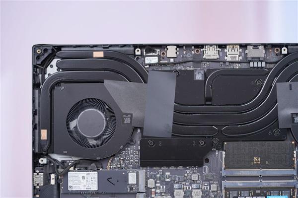 后盖上有垫高设通风设计,在两个固态硬盘位置都使用了导热片,值得好评。