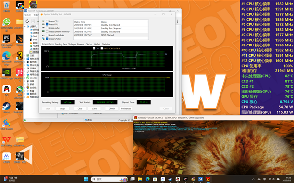 在狂暴性能模式下,笔记本的解热能力被完全释放,单烤CPU稳定在100W。双烤时功耗分配为55W+115W。此时CPU温度为82度。GPU温度为76度。