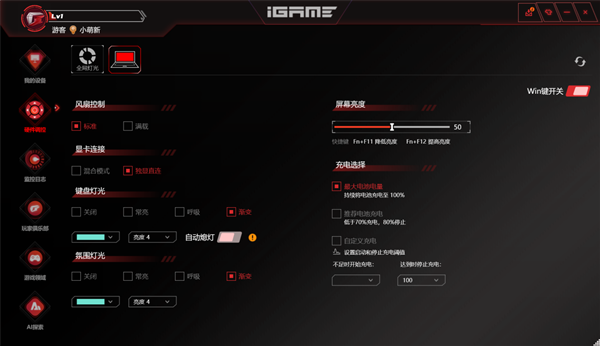 设备控制的界面,能自主控制笔记本的绝大多数硬件,包括风扇转速,显卡链接方式,灯光,屏幕亮度,电池充电等。