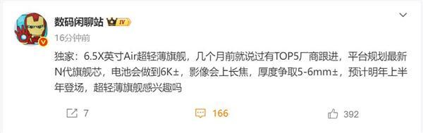 该博主表示,目前有厂商超薄机型开案了6.5英寸屏幕,搭载最新旗舰平台,电池容量能做到6000mAh左右,还有长焦镜头,机身厚度争取在5mm-6mm之间,明年上半年亮相。