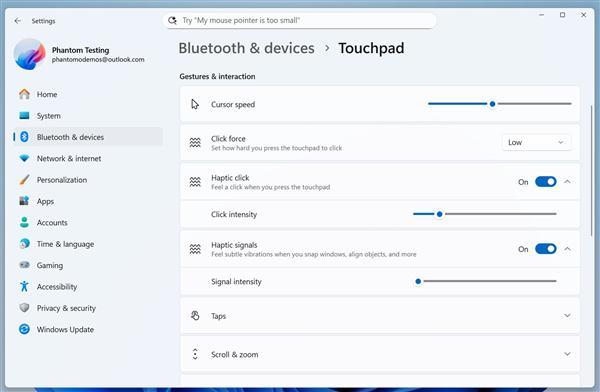 此外,微软还调整了触控板部分,添加了一些调整后的切换选项,例如灵敏度设置现在是一个下拉列表,触觉点击/信号现在是两个单独的滑块和切换选项。