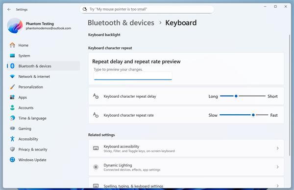 @phantomofearth发现,在最新的Windows 11预览版中,设置应用新增了一个键盘部分,用户可以在此更改键盘设置。