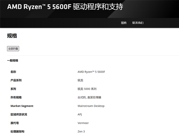 目前锐龙5 5600F已经出现在AMD的官方网站上,其详细规格也已公布,拥有与锐龙5 5600相同的6核12线程配置,但核心频率明显低于后者。