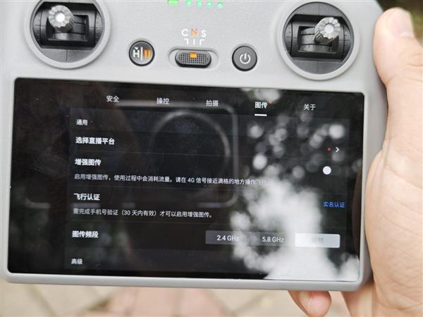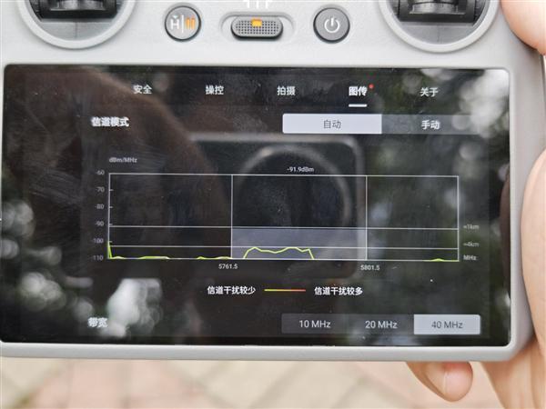 我们的长续航套装还额外支持增强图传模组,链接手机热点后可以使用流量传输,在城市环境下信号表现更稳定。即便飞到大楼另一侧,无线接收器被遮挡,图像传输仍然稳定流畅。在设置中可以自行选择频段和信道,根据不同的信道干扰状态自主切换。