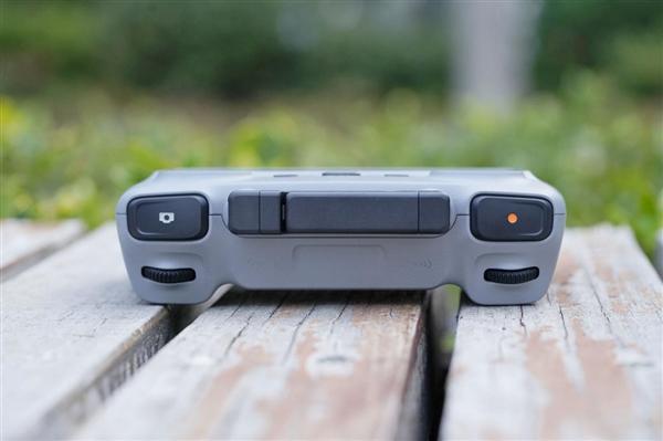 前方是折叠起来的双外置天线,摄像模式按键,拍照按键,下方左侧滑轮是镜头缩放调整。右侧滑轮是调整云台俯仰角度。