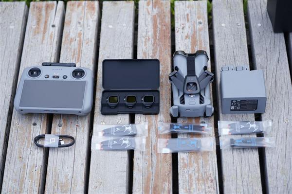 这就是长续航畅飞套装的所有内容:包含 RC2 遥控器、ND 减光镜套装(强光下降低曝光)、无人机本体(内置增强图传模组)、防护罩、三块长续航电池、电池管家、充电数据线,以及 6 对可替换无人机螺旋桨。
