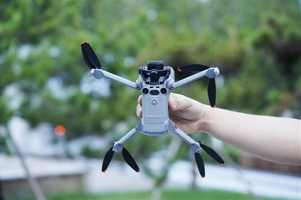 来到无人机本体,拆掉防护罩,可以看到大疆Mini 5 Pro在整体结构上与上代Mini4 Pro 保持一致,但在影像系统、避障等硬件部分进行了升级。机身整体颜色为灰色,螺旋桨的最外围是软性防碰的,有橙色的鲜明标识。