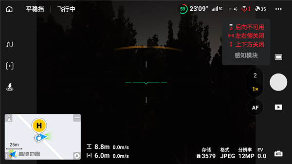 在实际飞行途中,避障系统探测到 5 米以内的障碍物时,会在遥控器屏幕上实时显示。可以在设置中选择遇见障碍物选择绕行或刹停。本次的Mini 5 Pro新增前置激光雷达在夜间也能显示身前的障碍物。