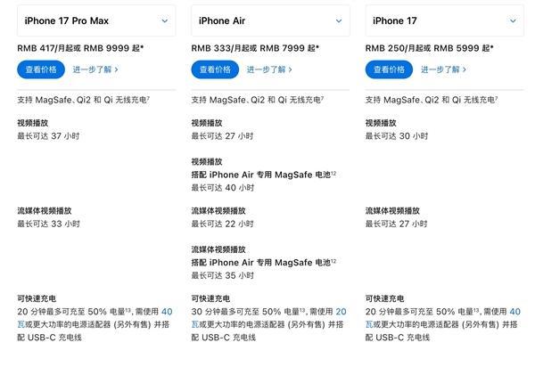 iPhone 17 Pro:256GB 8999元;512GB 10999元;1TB 12999元