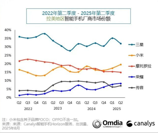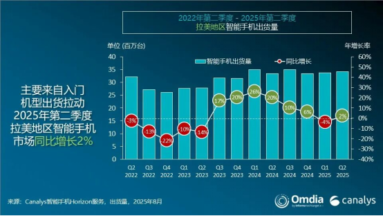 9月19日消息,市场调研机构Canalys近日发布报告,2025年第二季度,拉美智能手机市场出货量同比小幅增长2%,达到3430万部。