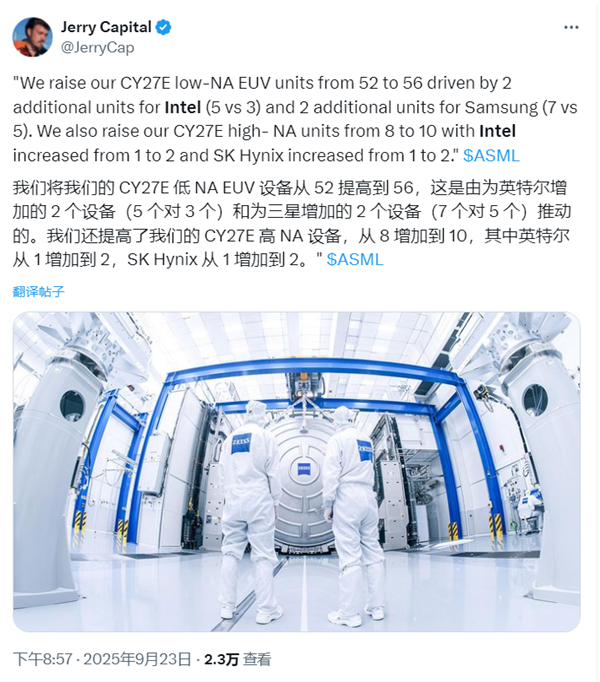 9月25日消息,据报道,Intel正在加码采购ASML的High-NA EUV光刻机,计划购买两台相关设备,这一数量较之前计划的单台设备翻了一番。