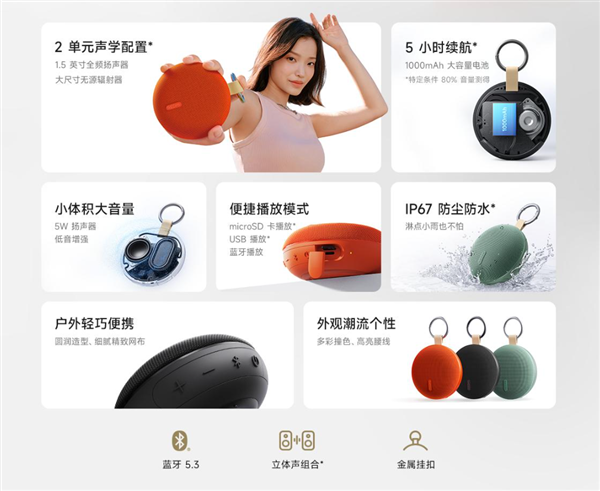 REDMI蓝牙音箱2提供雾哑黑、山岚绿、珊瑚橙三款配色,机身采用网布包裹,自带防滑脚垫和可拆卸金属挂扣,方便挂在背包上。