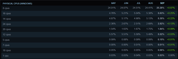 此外,8核CPU的份额正在稳步上升,目前已达到25.28%,较8月增长了0.87%,与此同时6核CPU的市场份额首次降至30%以下。