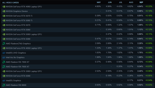 在显卡方面,RTX 4060移动版以4.84%的市场份额位居榜首,但RTX 5060笔记本显卡的市场份额也在稳步上升,未来有望取代RTX 4060的位置,但估计还需要很久。