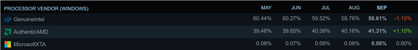 不过在CPU市场AMD的表现尤为突出,9月AMD CPU的份额达到了41.3%,创历史新高,而英特尔的市场份额则降至58%。