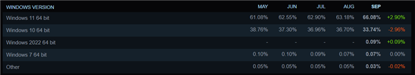 10月4日消息,Steam发布了最新的硬件调查报告,揭示了在显卡、CPU、操作系统和显存容量等方面的关键变化。