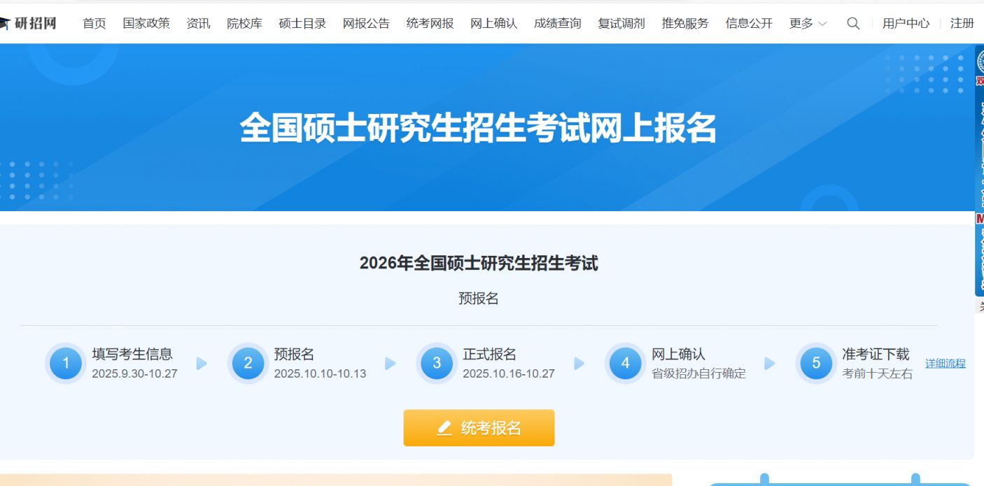 国硕士研究生招生考试报名包括网上报名和网上确认两个阶段。其中,网上报名时间为2025年10月16日至10月27日(网上预报名时间为2025年10月10日至10月13日,相关工作安排由各省级教育招生考试机构确定并公布),每日9:00~22:00。